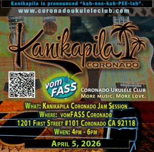 | The Coronado Ukulele Club’s mission and vision is to spread love into the world by playing music on our ukuleles. We welcome strummers of all ages and stages uplifting one another musically with the kindness of Ohano. All cultures, music and people are honored, respected, and celebrated in our club.